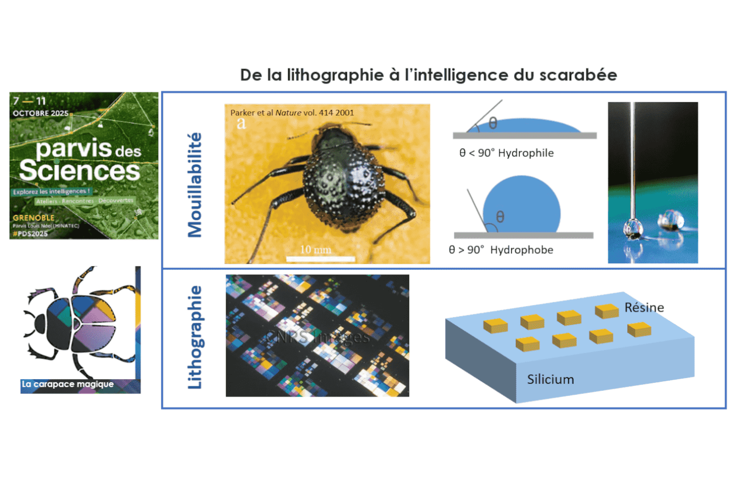 Dans l'animation de leur stand "De la lithographie à l'intelligence du scarabée", les animateurs partent d'un mécanisme de biomimétisme du scarabée du désert pour introduire les principes d'hydrophile/hydrophobe, la lithographie et la nano-impression.